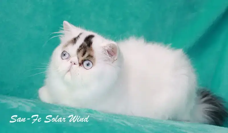 San-Fe Solar Wind presenta una morfología que refleja fielmente el estándar del Exotic Longhair. Su cabeza es ancha, redonda y bien desarrollada, con un stop profundo y un perfil armónico que realza la dulzura de su expresión. Los ojos, grandes, redondos y de un azul intenso y luminoso, son su rasgo más distintivo y aportan una mirada cautivadora. Las orejas, pequeñas, redondeadas y correctamente implantadas, acompañan la armonía del rostro. Su cuerpo compacto y sólido, de proporciones correctas, se sostiene sobre extremidades cortas y fuertes que transmiten firmeza y equilibrio. El pelaje, largo, denso y sedoso, con un patrón limpio, resalta su silueta y culmina en una cola tupida y bien formada. Un ejemplar que combina elegancia, tipicidad y refinamiento.